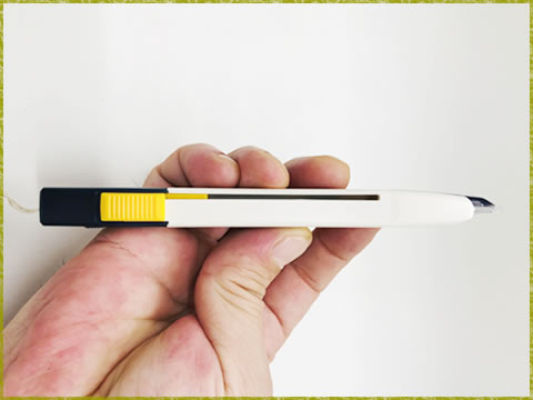 本体上部にはスライダー(黄色い部分)が配置され、サイドに配される通常のカッターとは一線を画しています。本体の断面形が逆三角になっているので「ペン持ち」がしやすく、上部の平らな部分に指を当てられるので、力をかける作業でも持ちやすくなります。
