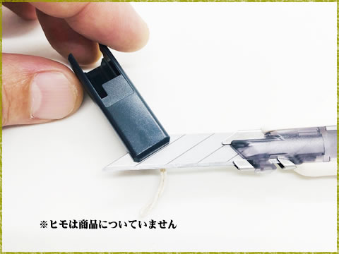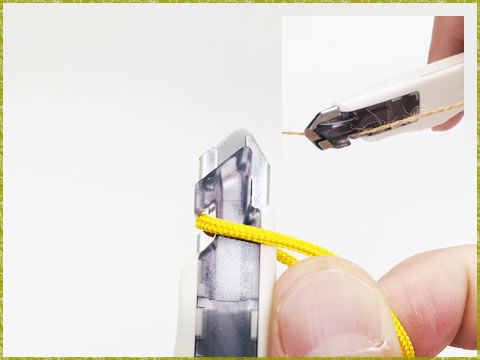 オマケ的な機能として、ヒモ切りがあります。先端部の切れ込みにヒモを当てて引くことで、刃を出さなくてもヒモを切ることができます。