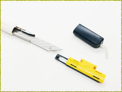 刃の交換は、通常のカッターと同じようにできます。後部の黒い部分を外し、スライダーを後ろにスライドして外すと、刃を取り出せます。