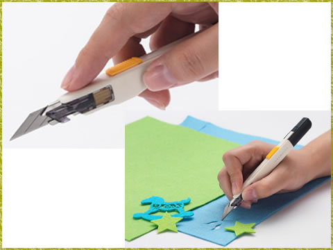 デザインナイフやアートナイフなど、細かい作業ができるペン型のカッターはいくつもありますが、このプレシジョンカッターは通常のカッターのようなボディ形状でありながら鋭角刃を採用し、繊細な作業ができるようになっています。 安定した持ち方ができるようボディ形状を見直し、刃を出し入れできるカッターにありがちな刃のブレをなくすための工夫も施し、アートナイフに負けない使いやすさに仕上がりました。