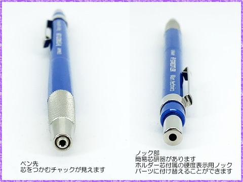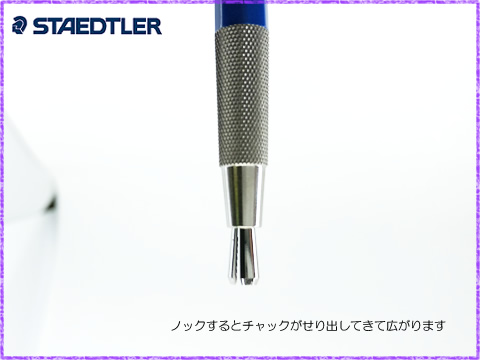 芯ホルダーは、ノックによって芯が出てきますが、シャープペンのようにカチカチというラチェット式ではありません。ノックをすると芯を掴んでいるチャックが緩み、芯がフリーになりますから、お好みの長さだけ出してお使いください。
