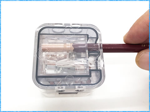 この634鉛筆削りは 1.まず木の部分を削る 2.芯を削る という2段階方式にすることで削る時の力が格段に少なくて済み、回転のブレを抑えてきちんと削れるように作られました。
