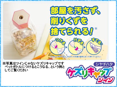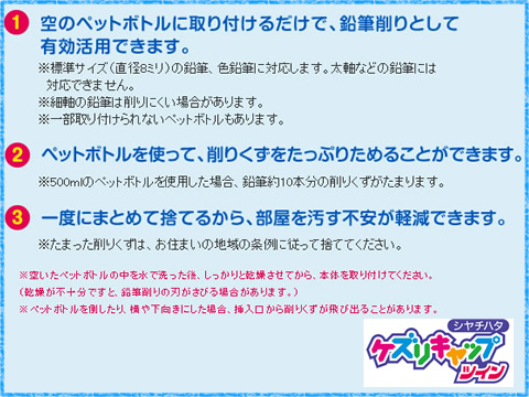 ペットボトルのフタの代わりにはめて使う鉛筆削りです。削りかすがペットボトルの中にたまるので、お部屋を汚すことがなく、小さなお子様でも簡単、安全に鉛筆を削って頂けます。