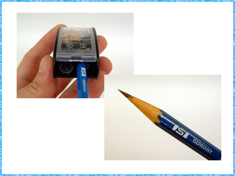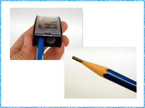 まず、片方に鉛筆を差し込んで削ると、鉛筆の木の部分だけが削れます。次に隣の穴で削ると、芯だけが削れます。