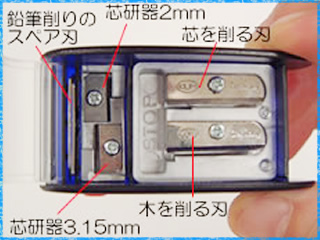 側面には、2mmと3.15mmの芯研器用の削り器も付いています。芯ホルダーに鉛筆にと、これ一個で充分です。鉛筆削り用の替刃が2枚内蔵されています。
