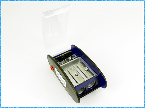 上部の透明のカバーを空けると、このようになっています。右側は、上で説明した鉛筆削り。左側には、芯ホルダー等に使う、芯研器がついています。 芯研器は、一般的な2mmと、少し太めの3.15mmを削ることが出来ます。その隣には、鉛筆削りの替え刃もセットされています。