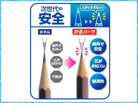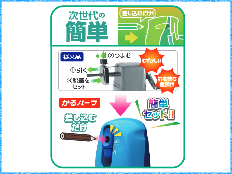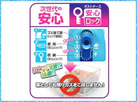 小さなお子様の為に考えられた鉛筆削りです。鉛筆は差し込むだけでロックされ、そのまま削ることができます。回すハンドルも従来の約半分の力で回すことができ、 さらに回しやすさを追求したボディ形状でとにかく楽に削れます。また、不必要に鉛筆が尖らないように、従来よりも鈍い角度で削りあがるようになっています。 差し込む口のプレートを動かすことで鉛筆が入らないようにロックすることができ、同時にダストケースも開かないようにロックされます。持ち運ぶときにダスト ケースが開いて周りを汚すことを防止できます。